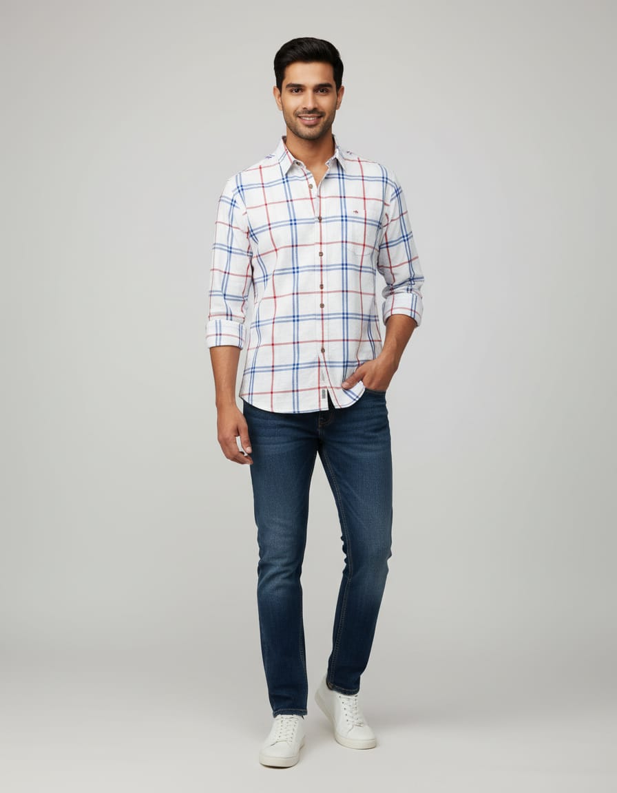white with red and blue checked